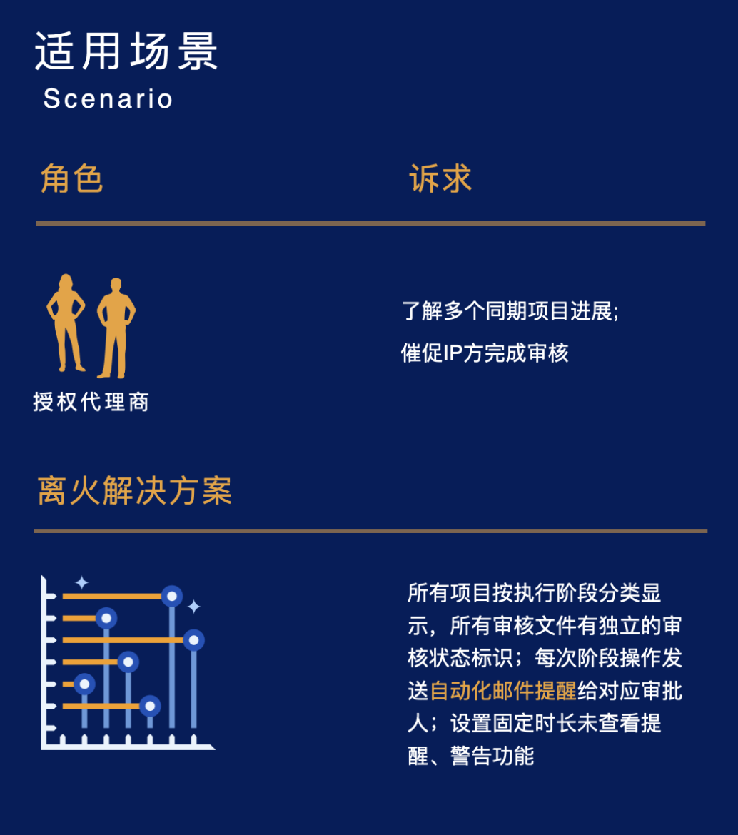 参考国家文物局编制的《博物馆馆藏资源著作权、商标权和品牌授权操作指引》以及国际IP授权标准业务流程,离火IP授权运营管理SaaS系统以电子合约为纽带为授权角色用户共享授权资产,使授权合作常用操作流程化、自动化、数据化,从原则上减少重复性工作和非必要信息噪音,增进合作方共识及有价值信息提炼。