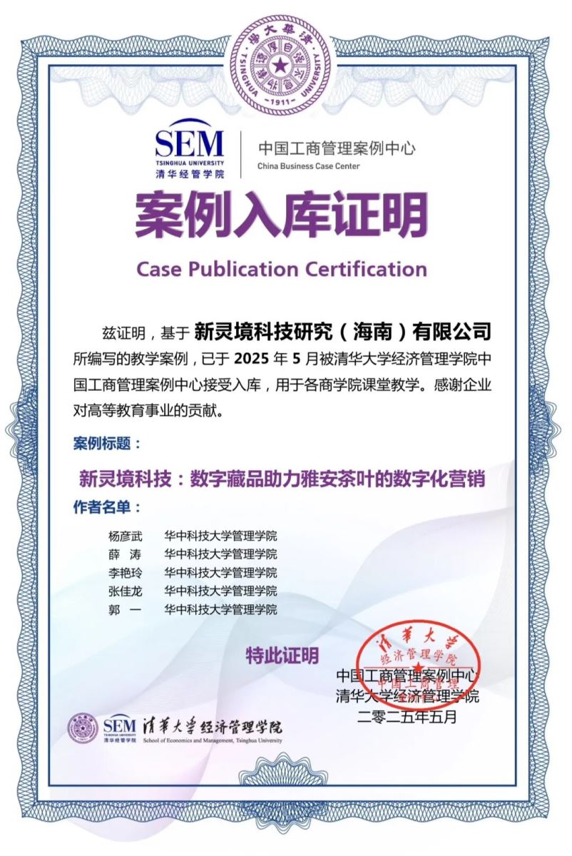 月前,新灵境科技研究(海南)有限公司打造的“数字藏品助力雅安茶叶数字化营销”实践,正式被清华大学经济管理学院中国工商管理案例中心收录为教学案例。这标志着新灵境科技在数字技术与实体经济融合领域的探索与创新,获得了国内顶尖商学院的权威认可,其商业模式与前沿实践将成为滋养未来商业领袖的重要养料。