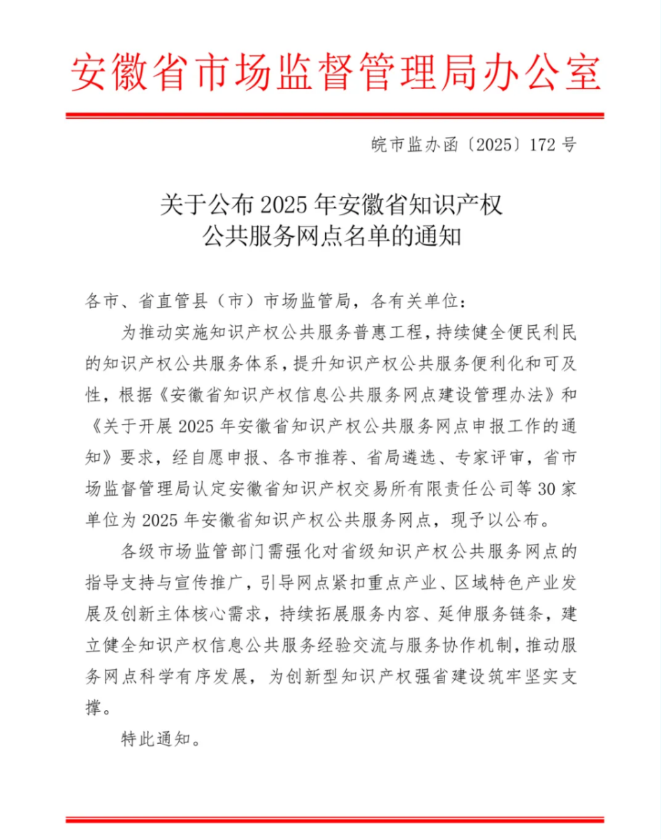 近日,安徽省市场监督管理局(安徽省知识产权局)正式公布省级知识产权公共服务网点认定结果,合肥市兴净信知识产权运营中心(以下简称“兴净信”)成功入选!